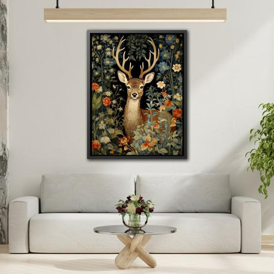 Deer in Floral Nature Forest Canvas - Framed Animal Wall Art Painting Prints