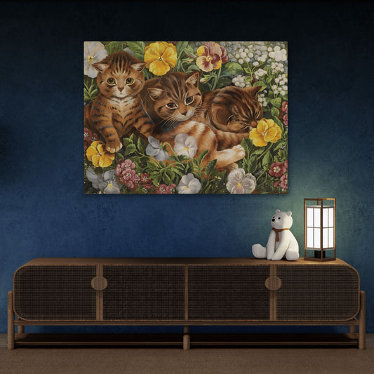 Louis Wain Three Kittens in a Flower Bed - Cats Canvas Wall Art Reproduction