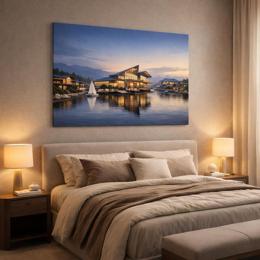 Contemporary Waterfront Village Waterside Resort Nature - Canvas Wall Art Print