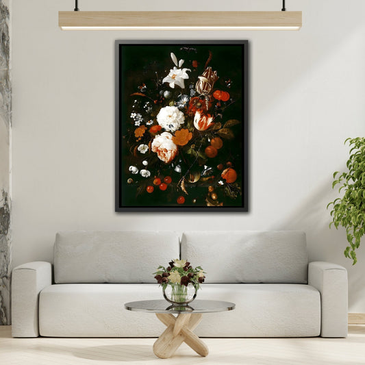 Jan Davidsz de Heem Flowers in a Glass Vase with Fruit - Framed Canvas Art Reproduction in Black Pinewood Frame