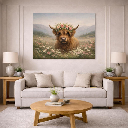 Floral Highland Cow Animals - Canvas Wall Art Print