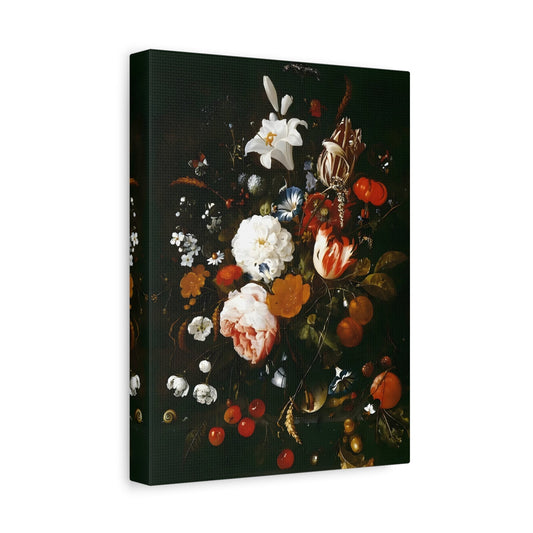 Vintage Moody Flowers in a glass Vase with Fruit -Floral Canvas Wall Art Print