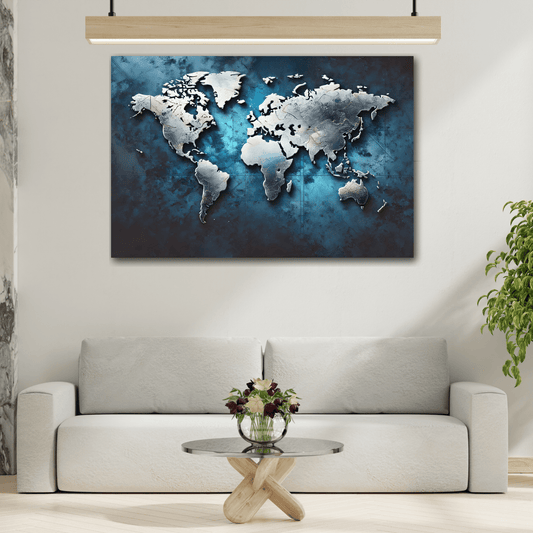 Metallic World Map Canvas Print - Large Blue Silver Travel Wall Art