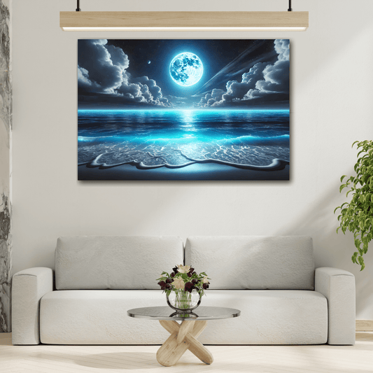 Moonlit Ocean Canvas Wall Art - Blue Moon Sea Landscape Picture Print Painting