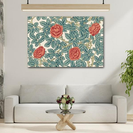 Vintage Floral Red Roses Green Leaves Canvas Print - Botanical Wall Art