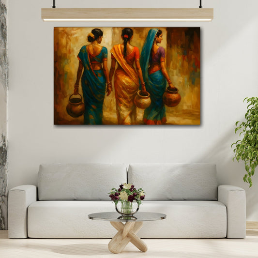 Indian Woman Canvas Print - Colorful Sarees and Pots Rural Life Wall Art
