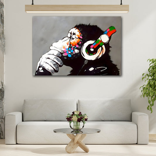 Monkey Banksy DJ Graffiti Canvas - Funny Thinking Music Gorilla Wall Art