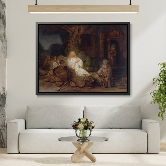 Rembrandt Abraham and the Angels - Framed Canvas Wall Art Print in Black Pinewood Frame
