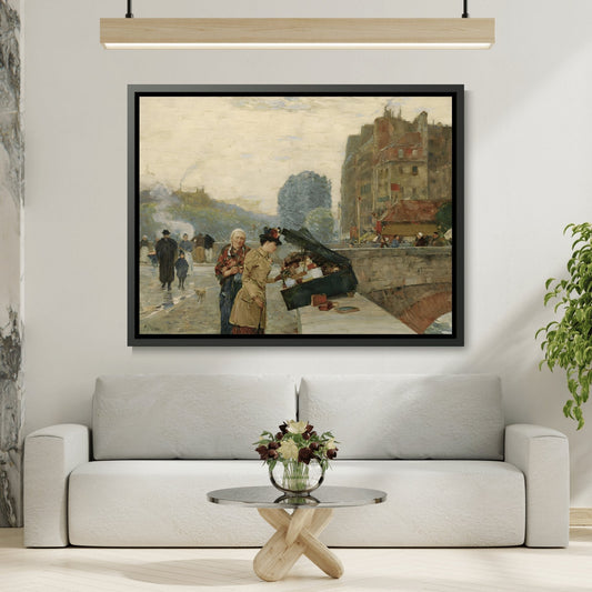 Childe Hassam Quai St. Michel City Landscape - Framed Canvas Wall Art Print in Black Pinewood Frame