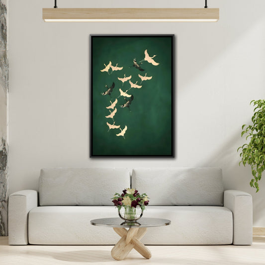 Japanese Wall Art Cranes Birds Canvas Print - Green Gold Emerald Eclectic Living Room Decor in Black Frame
