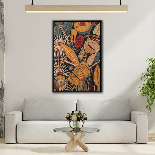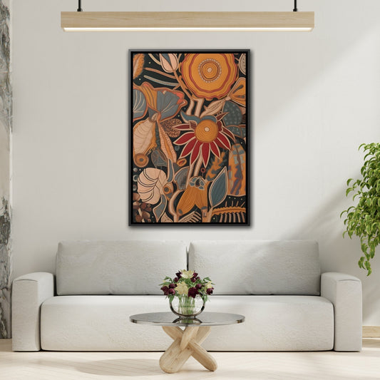 Boho Flowers Botanical Canvas Print - Modern Floral Living Room Wall Art Prints in Black Frame