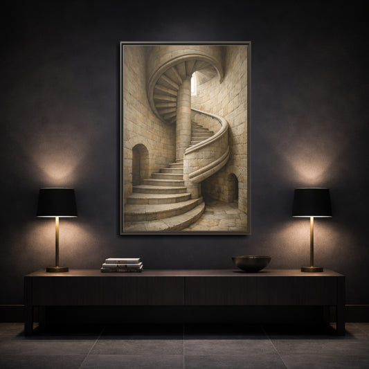 Vintage Spiral Staircase Tan Stone - Framed Canvas Wall Art Print
